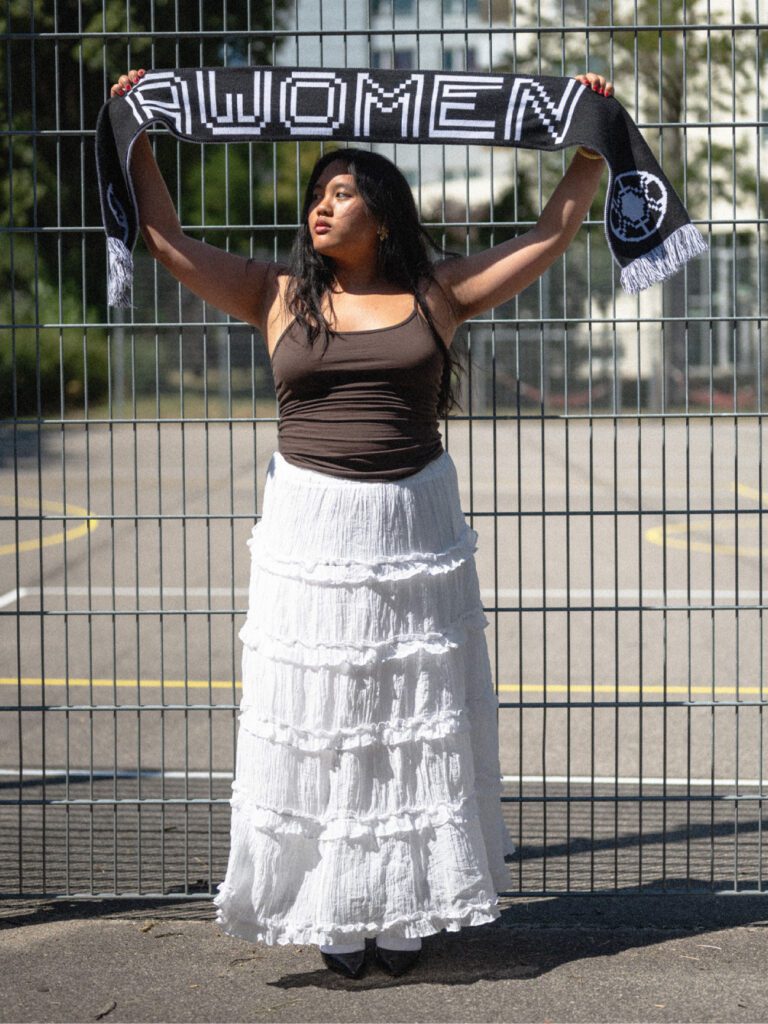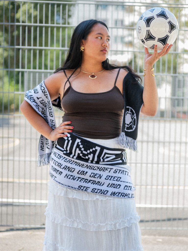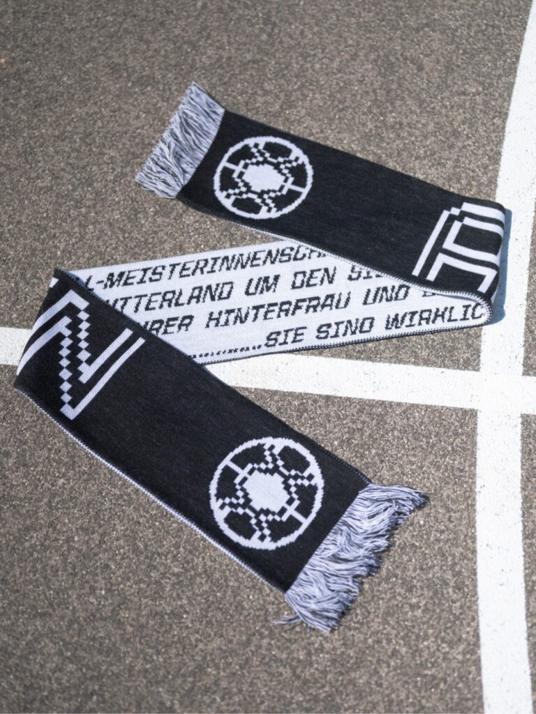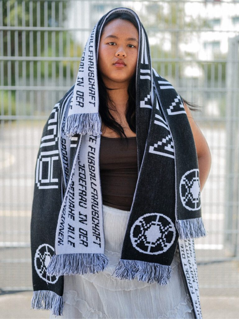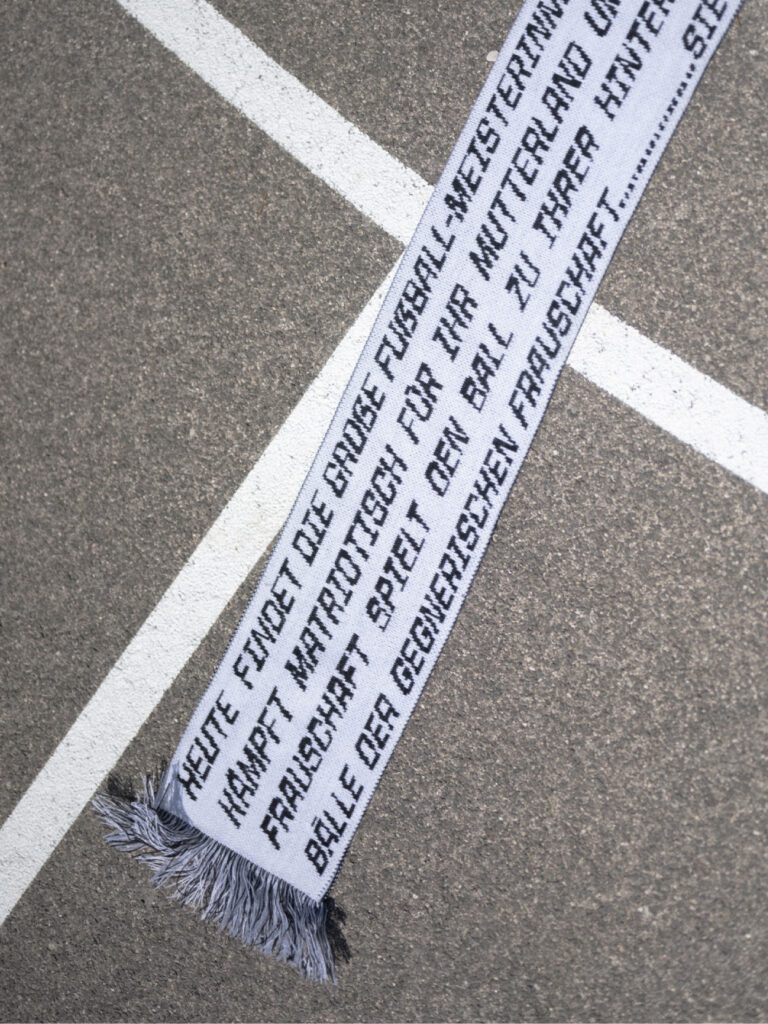 Entwurf eines Fußballfrauschaft-Fanschals basierend auf meinen Text.