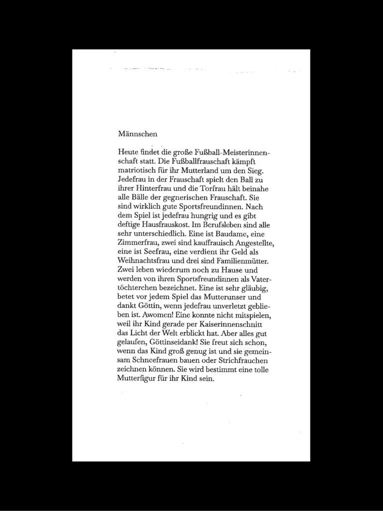 Ein Text über Männschen, Sportsfreundinnen und Strichfrauchen. Ein Spiel mit Wörtern, die uns vertraut scheinen – bis sie es nicht mehr sind. Sie brechen Gewohnheiten unserer immer noch männlich dominierten Sprache und fordern uns auf, diese zu hinterfragen.
