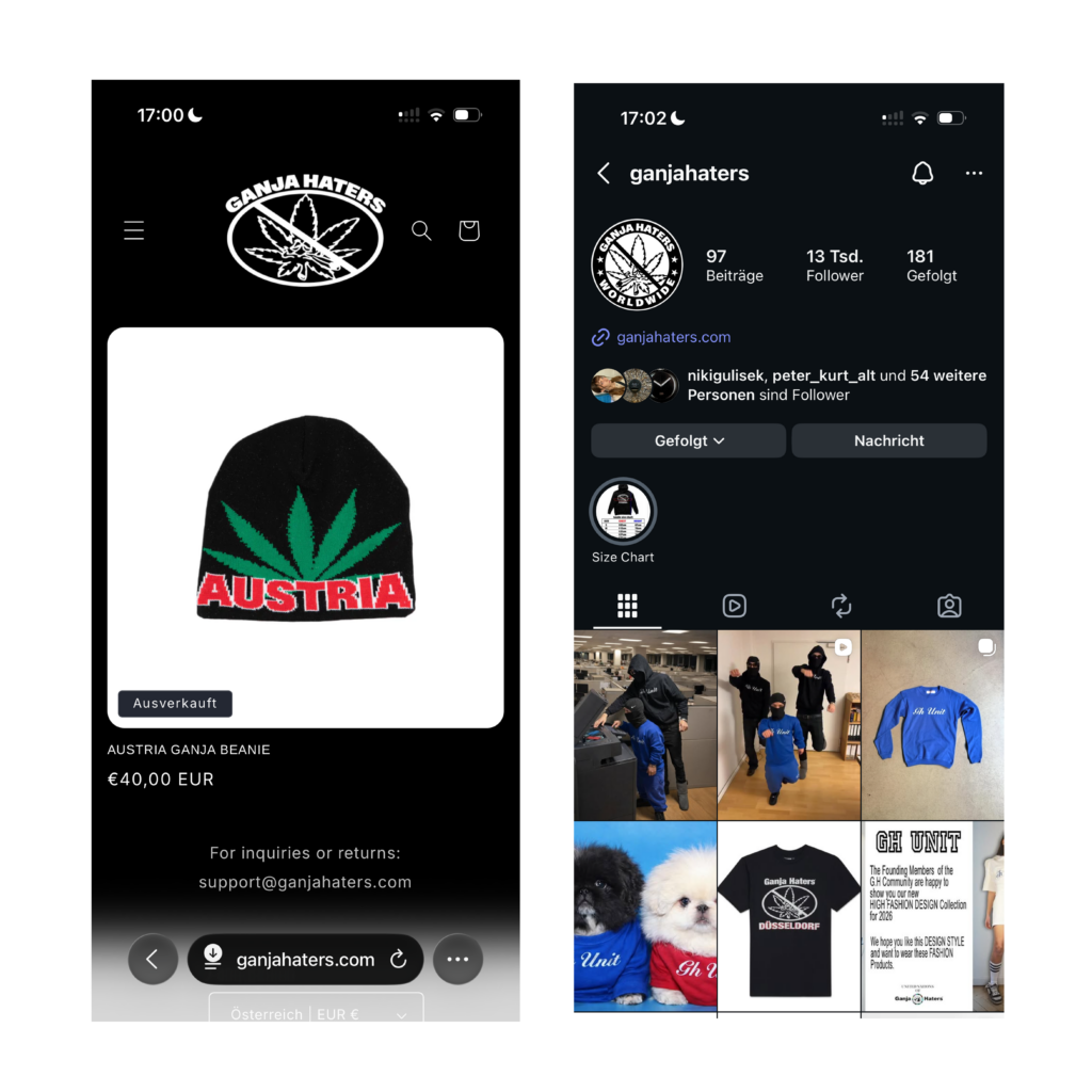 Hier zu sehen ist die Website/instagrammpage ganjahaters, entwickelt als Plattform für den Verkauf digitaler Inhalte und Produkte, vorallem Merch. Die Seite wurde gezielt darauf ausgelegt, hohe Reichweite zu generieren und eine klare, verkaufsorientierte Nutzerführung zu bieten. Durch die Kombination aus prägnantem Design und strategischer Vermarktung konnten große Verkaufszahlen erzielt und signifikante Einnahmen generiert werden.