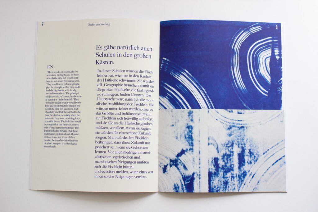 Eine gestalterische Umsetzung zu dem Text “Wenn Haifische Menschen wären” von Bertolt Brecht. Es handelt sich um ein 16-seitiges Bilderbuch im A4 Format. Hierbei ging es vor allem um das visuelle Erfinden und einen Ausgleich zwischen Strategie und Experiment zu schaffen.