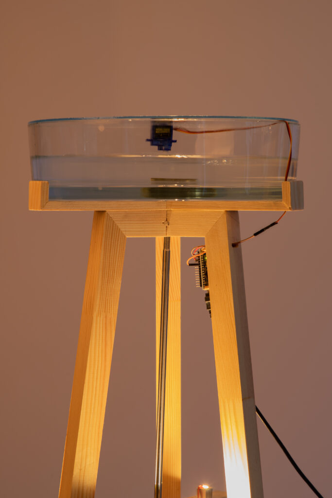 This project was all about designing a product which creates light and shadow. The approach was experimental, thereby we gained empirical knowledge of the immaterial material light. For our product we were inspired by water and the reflection it casts. The lamp consists of a wooden stand with a moveable light system, a glass bowl filled with water and a motor that moves the water.